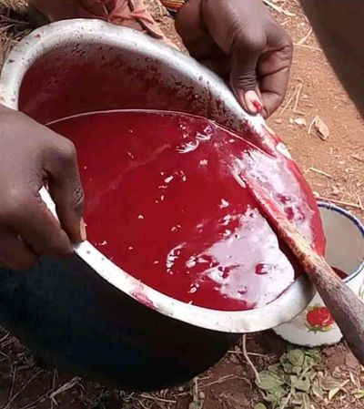 This actually men are holding the cow and simply the head should be straight to allow visibility of the vein then the third man is tie the cow on the neck and now ready to shoot using the special arrow,,,when we collect the blood we star to make it soft and mix with milk its ready to consume